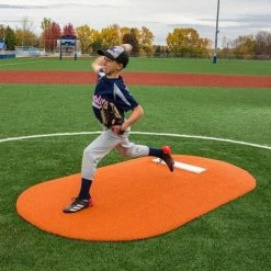 Each baseball pitching mound is designed with a full body, high performance poly protected resilient core with fiberglass reinforcement for a solid, no bounce, yet cushioned mound that reduces knee and ankle strain. Portolite pitching mounds are covered with the highest quality nylon AstroTurf® available in Clay or Green colors. Portolite simulated pitching rubbers last ten times as long and also have a hidden wear pad underneath the turf immediately in front of the pitching rubber. Built with gentle slopes and tapered edges to give the pitcher the highest level of comfort. Full length Game Mounds are available in 6”, 8” ,and 10” sizes to meet every age level.